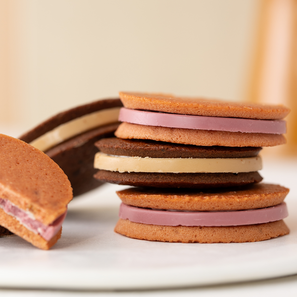 キャラメルのような香ばしい風味を感じるブロンドチョコレートに、アクセントとしてヨーグルトのような爽やかな酸味をプラス。カカオニブの食感が楽しいココアクッキーでサンドしました。